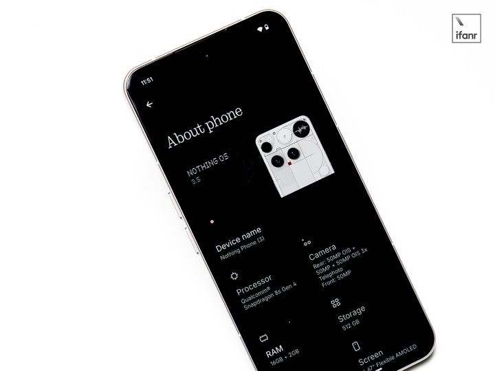 性能方面,运行基于 Android 深度定制的 Nothing OS 3.5,